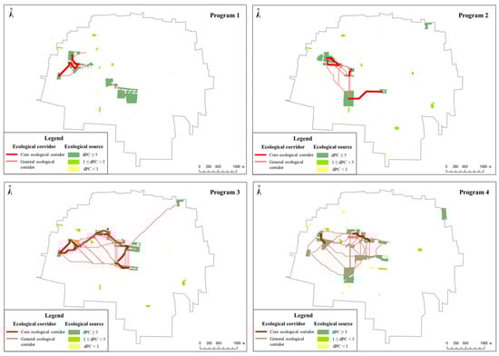 Morphological spatial pattern analysis (MSPA) has been used to identify cores with important ecological functions in rural ecosystem space, and eliminate the fine and fragmented patches among them [48,49,50,51,52]. In this study, Conefor 2.6 was used to measure the patch importance index of cores in order to select the parts with better ecological functions and better connectivity levels. The calculation method was as follows: