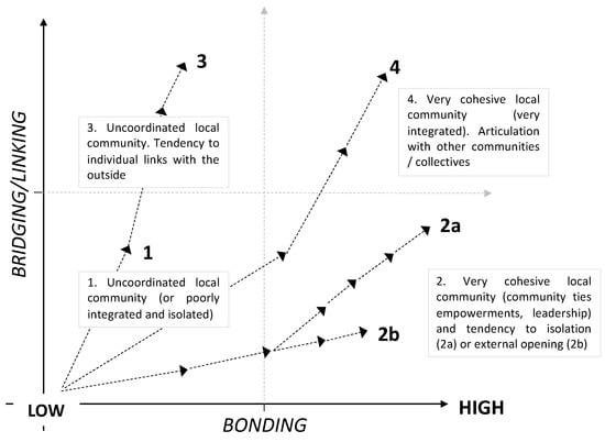SC can be understood as a requirement and/or as an outcome, which is not contradictory [45]. LEADER has fostered the SC from institutions or structures, such as Local Action Groups (LAGs), through participation and relationship building [18]. However, within this dark side of the SC, LEADER has been understood by a few as a tool at the service of elites, lobbies or clientelism [18], and even participation in the LAGs has generated a project class that is not very numerous [13], where access to and control of certain information is understood as power and, consequently, certain social groups are marginalised by not being able to access this information [46]. In order to understand the relationship between the concepts of SC and rural development, these have been studied and linked to the concepts of embeddedness and autonomy or the micro and macro levels [20,47]. Researchers such as Lewis [48], Woolcock [47] or Esparcia [20] argue that SC is best developed at the individual level, although it is a multilevel concept involving interactions at different levels, i.e., it is best measured and quantified at the individual level, but the benefits can be at the collective or community level [48]. Within SC, internal and external cohesion stand out; the former is characterised by SC Bonding, which is linked to social cohesion and internal relations. The second relates to external relations and is bridging and linking SC [49,50]. There is a direct relationship between the evolution and success of rural development processes and the increased stock of internal and external SC. Numerous authors have explained that in order for SC to contribute positively to development processes, it must exist in a balance between SC, as these are not independent of each other, but feedback on each other, are stimuli and are the basis for development processes [20]. Figure 1 identifies the different scenarios that communities or areas can present in relation to cohesion and development related to internal and external SC stocks.