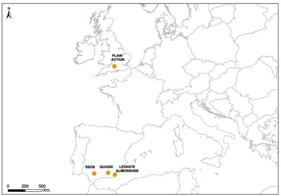 The first criterion for the selection of the study areas was the fact that they were disadvantaged rural areas, and this is what highlights their consideration, continued over time, as areas for the application of territorial development strategies (LEADER approach) from 1996 to the 2014–2020 period. Four study areas have been worked on, three in Andalusia and one in England. Andalusia is the second largest Autonomous Community (A.C.) in terms of rural area in Spain, with a total area of 87,599 km2, i.e., more than 79% of Andalusia’s surface area is rural and therefore accounts for 17% of the rural area of the whole country [54]. It is also the A.C. with the highest number of farms and family farms, accounting for a quarter of the national total. However, it is in this community where the Gross Domestic Product (GDP) per capita is the lowest (€18,906) [54].
