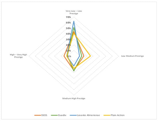 It is, therefore, important to know the distribution of actors in each of the study areas according to the previously defined levels of prestige (Figure 3). Approximately all four study areas have a sample that behaves (with some exceptions) in a similar way. If we focus on the study of the low average level of prestige in the different areas, it is true that, on average, this is one of the subgroups with the lowest percentage of actors (16%), except for Plain Action, which accounts for almost 30% of the actors. However, if we add to this the percentage of actors in the sample who already said they had a Very low–low prestige, in some cases, we already have more than two-thirds of the sample, especially in the case of Almeria (71%) and the English area (67%). This is a rather negative result since most of the actors obtain levels of prestige between very low, low and medium-low. If we look more closely at the two substructures where the levels of prestige are highest (medium-high and High–very high), we can see that the first of these is where the second highest percentage of actors in the samples is concentrated (except in Plain Action, where it is Medium Low). The areas with the highest percentage of actors concentrated in the medium-high level of prestige are Guadix and SSOS, with 27% and 26%, respectively, followed by Plain Action (22%) and L. Almeriense (18%). As for the last substructure (the most important of all), which brings together the high/very high levels of prestige, it can be observed that it is the one with the lowest percentage of actors in all areas (especially in L. Almeriense). If we add the two substructures where prestige is higher, we can see that the areas with the highest number of actors are SSOS (40%) and Guadix (37%) and, at a certain distance, Plain Action (33%) and Levante Almeriense (29%).