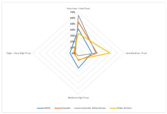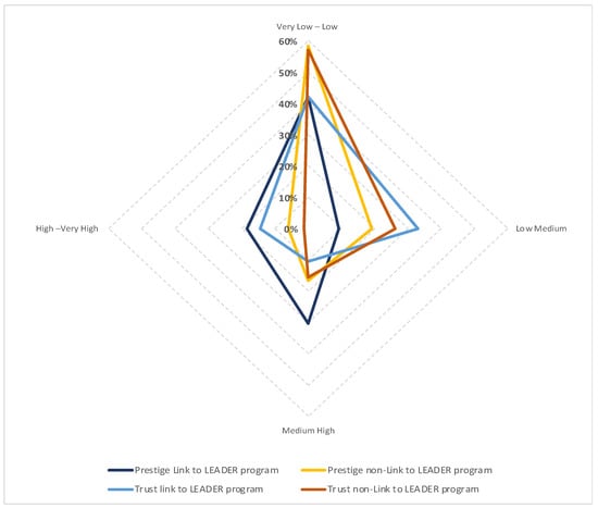 - Trust: Understood as affinity, a closer and stronger relationship between actors. The levels have been grouped in the same way as for prestige: Very Low–Low, Low–Medium, Medium–High and High–Very High.