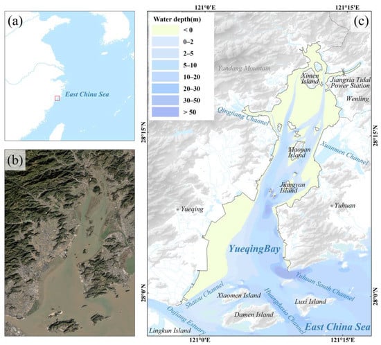 Map of the study area. (a) Location of the study area. (b) Landsat-8 images: 20 September 2021. (c) Topography of Yueqing Bay in 2021.