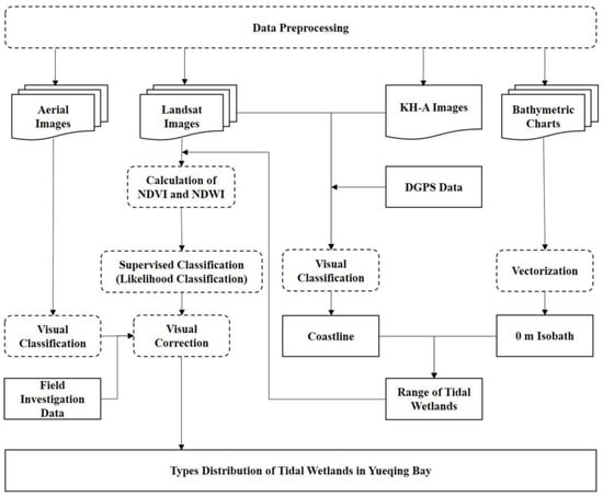 Supervised classification was widely used to map land cover types in small study areas []. Among the various methods of supervised classification, the likelihood classification showed the best interpretation effect in the preliminary test. Therefore, the likelihood classification combined with visual interpretation were used to achieve a more accurate classification of the tidal wetland types in Yueqing Bay.