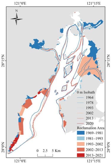 Changes in coastline and the 0 m isobath in Yueqing Bay. The location of the coastline was determined by the outer boundary of the reclamation area in each time point.