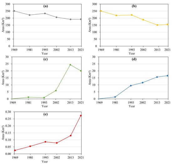 The area of tidal wetland types in Yueqing Bay during 1969–2021. (a) Total tidal wetlands, (b) tidal flats, (c) tidal marshes, (d) artificial ponds, and (e) mangroves.