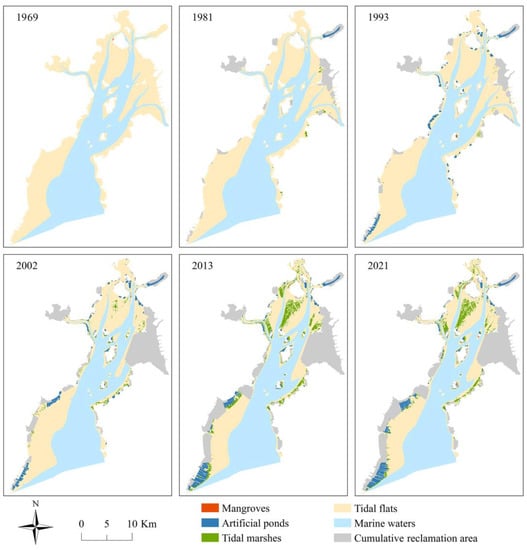 The tidal wetlands were visually interpreted on the KH-A images of 1969 and 1970. The distribution of tidal wetland types in this time point was regarded as the natural initial state of Yueqing Bay prior to disturbance from human activities. The likelihood classification of supervised classification provided by ENVI 5.3 was then used to classify the Landsat images. During selection of input the training samples, we used NDVI and NDWI indexes to help distinguish vegetation from non-vegetation, and water from non-water. To reduce the error, the classification results were corrected using visual interpretation after automatic classification. In line with the coastline extraction process, the visual interpretation correction of wetland types was also performed recursively forward in time. The areas that changed were modified to obtain the distribution results of wetland types in each time point (Figure 2). The mangroves in Yueqing Bay were all artificially cultivated, and the shape of the patches was relatively regular. The Landsat image series had a more successful interpretation outcome for perennial mangrove forests, but not for newly planted mangrove seeding areas with sparse vegetation and underdeveloped leaves. To this end, this study used up-to-date aerial imageries to supplement the visual interpretation of newly planted mangrove saplings. Mudflat aquaculture in Yueqing Bay is divided into two types with pond cultivation along the coast and shellfish cultivation on the tidal flats, both of which belong to different wetland types. To distinguish these two wetland types, we compared remote sensing images with low cloud cover and high tide levels to the images used for classification in a similar time point. The areas in the images exposed to high tides were pond cultivation areas. Meanwhile, the ones submerged during high tides were the shellfish cultivation areas on tidal flats.