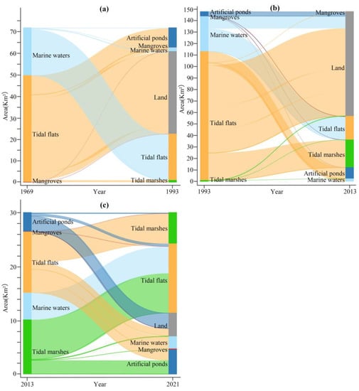 Sankey diagram of the transformations of the tidal wetland types. (a)1969–1993. (b) 1993–2013. (c) 2013–2021.