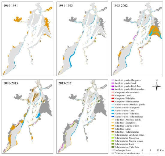 Figure 7 shows that since 1969, the spatial transformation of tidal wetland types in Yueqing Bay occurred in different time intervals. From 1969 to 1993, the change in tidal wetlands mainly occurred in the upper tidal flats along the coast. During 1969–1981, large areas of the tidal flats were transformed into land along the east and west coasts of the inner bay. During 1981–1993, artificial pond cultivation started spreading extensively in the bay. The tidal flats on the west side of the bay continued to silt up and expanded seaward. Compared with the previous time interval, from 1993 to 2021, the areas with changing tidal wetlands gradually extended from the upper tidal flats to the middle tidal flats, and the regions of variation became increasingly fragmented. During 1993–2002, tidal marshes colonised the upper tidal flats of the bay. Pond cultivation in the bay mainly expanded along the coastline, and the large area of tidal flats and shallow marine waters in the Xuanmen Channel area were converted into land. During 2002–2013, parts of the tidal flats along the west side of the outer bay were converted into land. Pond cultivation expanded in the bay, most prominently vertically towards the middle tidal flat areas perpendicular to the coastline. During this time interval, the spatial distribution of the tidal marshes expanded substantially, and vegetation covered all the exposed tidal flats on the upper tidal flats of the bay. During 2013–2021, the number of large patches transitioning to non-wetlands on the upper tidal flats near the coastline decreased compared to previous time intervals. The type conversion mainly occurred between tidal marshes and tidal flats, and was mostly scattered in the middle tidal flats.