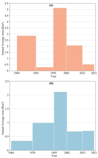 Before the 1990s, pond cultivation was almost absent in Yueqing Bay (Figure 5). However, after the 1990s, with the advance in artificial breeding technology, pond cultivation activities gradually increased, which were mainly distributed on the west coast of Yueqing Bay. The area under these activities was 9.48 km2 in 1993, which increased to 44.61 km2 in 2003, 15.6 km2 in 2013, and 16.59 km2 in 2021. Previous researchers’ monitoring of aquaculture pond areas in China’s coastal areas from 1984 to 2016 showed that the largest expansion of aquaculture ponds in the coastal zone occurred during 1990–2000 []. However, the expansion trend slowed down since 2000 []. This was consistent with the expansion trend of aquaculture ponds in Yueqing Bay. Similar to the reclamation project, the seaward expansion of aquaculture ponds would also force salt marsh plants to grow in the mudflat zones along the outer edge of the culture area (Figure 5).