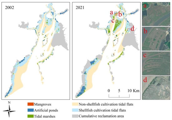 Distribution of shellfish cultivation, pond cultivation, and tidal marshes in 2003 and 2021. (a) The shellfish cultivation caused the U-shaped distribution pattern of S. alterniflora. (b) S. alterniflora was cleared in mangrove areas. (c) S. alterniflora was cleared in shellfish cultivation areas. (d) S. alterniflora grew again in the abandoned culture area.