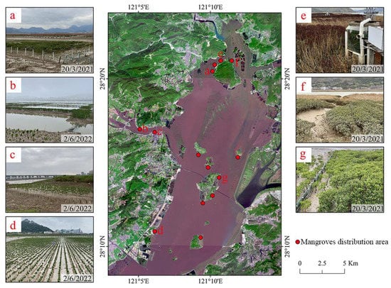 Distribution of mangroves in Yueqing Bay. (a) The protective net was set to prevent the invasion of S. alterniflora. (b–d) New mangrove afforestation area. (e) Mangrove groups are sheltered in the glasshouses on Ximen Island and mangrove crowns withered because of strong cold waves outside the glasshouses. (f) S. alterniflora invaded the mangrove area. (g) Mangrove area located on Maoyan Island.