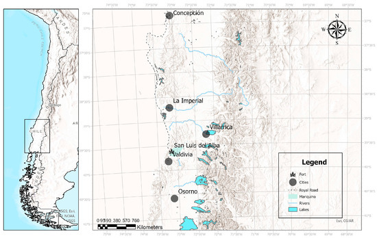To understand the historical geography of Southern Chile and how it has taken form in socioenvironmental terms, it is important to review the process of primitive accumulation to understand its early production of nature [38]. Primitive accumulation refers to the historical and violent divorce of the producer from the means of production, as the pre-existence of considerable masses of capital and labor power in the hands of commodity producers. This process constitutes the starting point of the capitalist mode of production. Following the decolonial conceptualization of Dussel [44], Quijano [7], Grüner [45], Escobar [46] and Mignolo [47], among others, this paper agues for the importance of considering the dialect between the development of capitalism in Europe and its “dark side” in the Americas to understand the Chilean colonial process and how capitalism could also be a construction from the peripheries to the center.