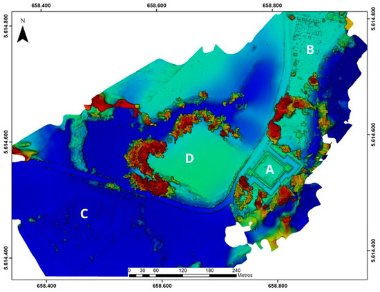 Data from interviews with local inhabitants suggest that the area surrounding the fort was populated in the early 20th century, in the time of their grandparents. Today, this area is a large cattle farm. The landscape elevation model shown in Figure 5 (obtained using Agisoft Metashape) illustrates possible signs of an urban settlement to the north and south of the San Luis Fort. The northern part of the fort moat seems to continue until it reaches the location of letter C. There is a mound or hill at D which, as suggested during the fieldwork, can be identified as a human intervention due to the existence of some form of steps (see Figure 6). Thus, this mound may have been part of the fort’s military defenses because it was connected to the fort, although this is a hypothesis.
