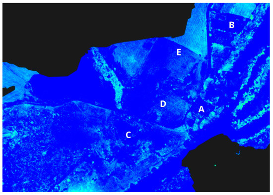 GNDVI analysis. Possible remains of Cruces Village and the San Luis del Alba Fort, October 2022. (A) San Luis del Alba Fort. (B) Possible remains of Cruces Village to the north of the fort. (C) Possible remains of Cruces Village to the south of the fort. (D) Mound or hill. (E) Cropmarks.