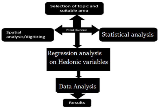 Following Figure 1 shows the framework of the whole methodology. In this formulation, a pilot survey was done to check the suitability of the area for the model. Furthermore, to check which variables have an influential impact on property values. This step is the formulation of the topic and geographical analysis, which includes the mapping of the study area, mapping of data collection points (represented in yellow and purple color in the maps), and their distance from neighborhood services in terms of spatial analysis. The primary data related to hedonic variables were collected through a questionnaire Supplementary Material, and a regression model was applied to check the influence of each variable on the total property terms as data analysis, the hedonic model uses statistical methods (multi-linear regression) to estimate the price/values of property [41]. After that, results were obtained by running the regression analysis. Around the world, this model has been implemented by several researchers and professionals for property value estimation [42]. The model estimate and evaluation of the potential structure, environmental, and neighborhood attributes on property values [39]. According to area characteristics, the method is best suited due to flexibility and found a perfect candidate for detecting the proximity to neighborhood services and property values assessment through GIS and statistical measurements, as proved by [43].