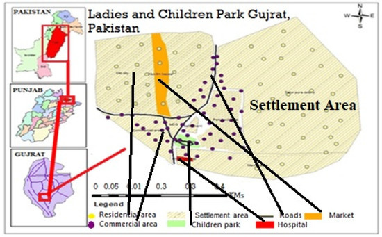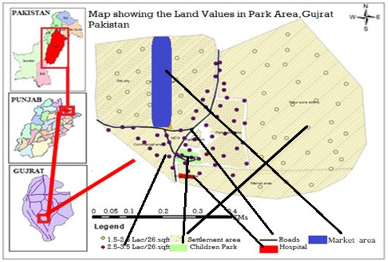This study takes into account the neighborhood properties comprising the location of the house/property, presence of a park near a house, proximity (walking distance) to major roads, hospitals, market area, and related facilities in one of the most congested urban areas of Gujrat, Pakistan [10]. Surrounding facilities have positive impacts on property value, and this association is well-acknowledged in past data [11]. The suitability of an area for the study is also a crucial issue during the concept development phases; however, the selected area is the most suitable, where all considered variables for hedonic measurements are applicable. The result of the study provides in-depth theoretical tools to urban geographers and concerned institutions for future planning, land allocation, and property sales and purchase decisions.