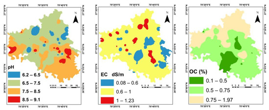 It is quite interesting to note such low spatial variability in the soil pH at the district level, which confirms the strong buffering mechanisms in action in the study area by various cationic and anionic compounds present in the soil. The spatial variability map of EC presented in Figure 3 shows that the regions with higher pH levels correspondingly revealed higher EC values of 0.6–1 dS m−1 and 1–1.23 dS m−1. The high EC values could be attributed to the application of fertilizer salts, and organic manures to the soil during crop production over the years [60].