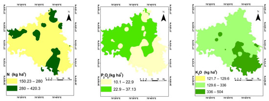 The N availability in the region is found to vary within the medium range of 280–560 kg ha−1. A comparison of the descriptive statistics results presented in Table 4 indicates that N varies from 150.2–490.3 kg ha−1, thus generating moderate variability in the region. This was quite natural considering a somewhat similar cropping intensity throughout the region, thus indicating similar residue additions over the year. The majority of the area grows wheat, which is followed by vegetable crops. Revealed here is that more or less similar fertilizer application rates are being followed in the study area, thus giving less scope for NPK variability in the region. The uniform agronomic practices followed throughout the region reduce the variability in essential plant nutrients in the soil and play a major role in homogenizing the data sets [61]. Although, indeed, the selection of the source and the mode of applying fertilizer products varies among farmers in the region, the fact remains that farmers without exception apply NPK to the soil, and this cannot be overlooked. In the case of micronutrients, the spatial variability in their distribution was quite high (Table 3; Figure 4). This could be attributed to the non-uniform adoption of balanced fertilizer application practices by farmers and, based on the socio-economic circumstances of farmers in the region, the selective application of nutrient elements to soil.