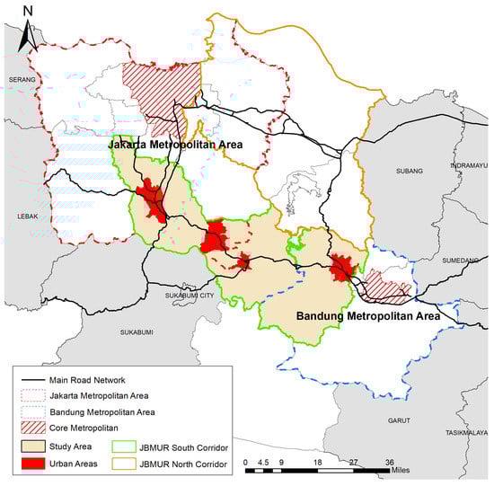 The Jakarta-Bandung Mega-Urban Region (JBMUR) is the biggest Mega-Urban Region in Indonesia followed by the monsoon Asia-urban development, where urban expansion is headed towards its surrounding urban zones, the hinterland, and the rural areas. The JBMUR is formed from the agglomeration process of Jakarta with its surrounding areas (Bogor, Depok, Tangerang, Bekasi) and Bandung with its surrounding areas []. Along the agglomeration process, both the metropolitan (Jakarta and Bandung Metropolitan) developed into a polycentric region, and with their increased interaction also expanded into a bigger formation of the agglomeration corridor that will form the JBMUR []. This growth and expansion have caused their hinterland to turn into a peri-urban or urban fringes with mixed characteristics of both urban and rural often mentioned as desakota []. The expansion in both the metropolitan areas has caused a decline in the environmental carrying capacity, Rustiadi et al. [,] also stated that the JMA already exceeded the carrying capacity, coupled with the state of the Puncak-Cianjur region, which also exacerbates it [,]. In addition, the environmental carrying capacity in the BMA also experiencing the same trend [,] due to the various land-use change and conversions.