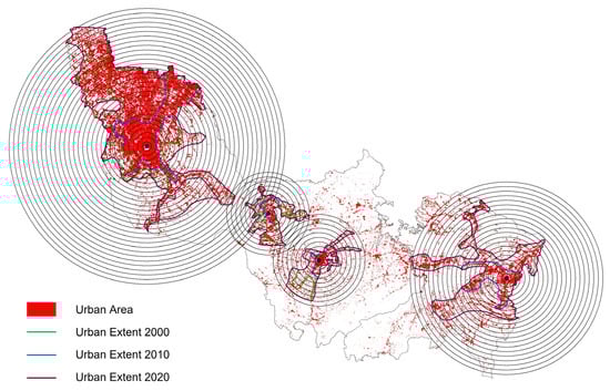where A is the total landscape area, Ut+n and Ut are the built-up areas at time point t + n and t, respectively. The higher value of the UEI represents the higher intensity and rate of urban expansion. Coupled with the concentric ring analysis, it can be used to determine the speed of expansion and the direction of expansion.