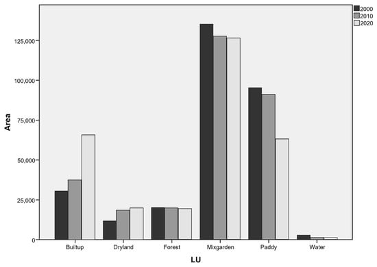 Overview of land-use area dynamics of JBMUR south conurbation corridor in 2000, 2010, and 2020 period.