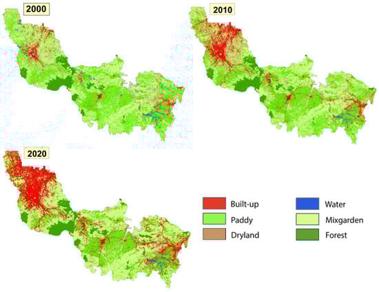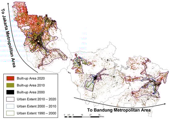 This research mostly used processed LANDSAT imagery from 2000–2020 to extract the land-use data using a supervised classification method and a maximum likelihood algorithm. The training samples will be provided from the field observations conducted in 2020, numbering at around 4482 training pixels based on the field survey. The supervised classification result gives a 94% accuracy on the land-use maps from the field observation results. The land-use derived from the LANDSAT are then classified into six classes: built-up (settlement, industrial area, facilities and services, commercial area), water (river and lake), dryland, mix garden, paddy field, and forest. Additional statistical data from each of the administrative regions are also used, as well as the spatial data derived from West Java, Jabodetabekpunjur, and Bandung Metropolitan’s spatial planning.