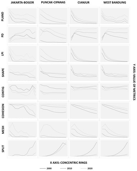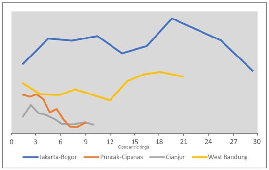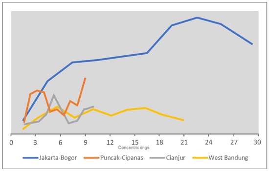 When compared directly (Figure 7), all four urban areas share relatively the same change pattern while the difference is located on the pattern changes’ intensity or degree. Generally, the Jakarta-Bogor urban corridor always comes with higher intensity of changes in its indicators and metrics. The Jakarta-Bogor urban corridor also has a fluctuating metrics value in its series of concentric rings. This pattern happens mainly because the effect of urban expansion coming from the Jakarta Metropolitan Area has been directly experienced by the Jakarta-Bogor urban corridor as it is bordering directly with the Jakarta metropolitan core. Another cause of the massive growth in the Jakarta-Bogor urban corridor is due to the development of Depok City that facilitates Jakarta’s growth and passed it towards the Jakarta-Bogor corridor.