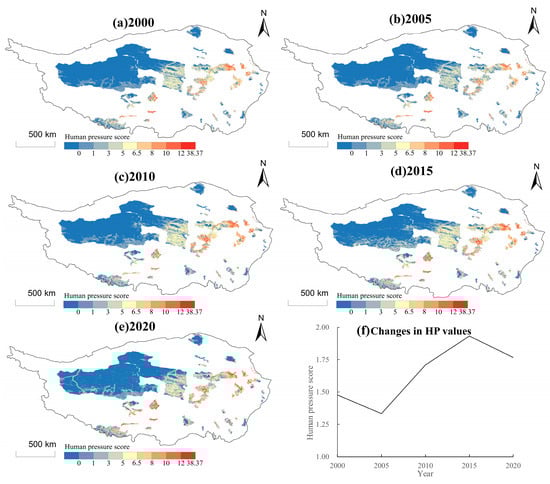 The results of this study showed that the overall HP value on the NRs of the Qinghai–Tibet Plateau decreased from 2000 to 2005 and from 2015 to 2020, which indicates obvious positive effects in mitigating human activities in these two periods. Similarly, the protection measures adopted in the reserves were also partially effective against the five types of human interference factors. HP on the NRs of the Qinghai–Tibet Plateau was high in the east and low in the west, results that are in line with recent studies, specifically with the global HF data reported in Venter [25].