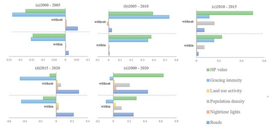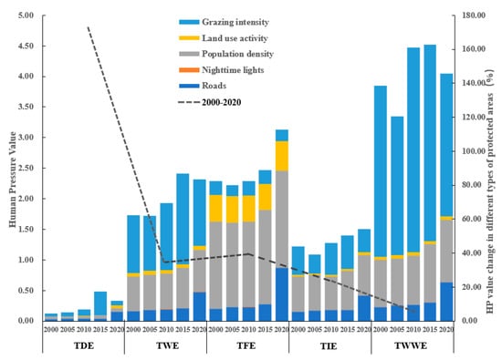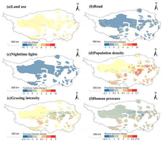 In the experimental zones of the NRs, population density and grazing intensity were effectively alleviated from 2000 to 2005, and the HP values associated with each of them decreased by 0.005 and 0.24 37, respectively (Figure 7). The land-use intensity, road construction, population density, and night-light values increased by 0.4091, 0.0029, 0.1681, and 0.0227, respectively from 2000 to 2020, which indicated that the mitigation effect of protection measures on these four HP values was poor, especially for road construction from 2015 to 2020.