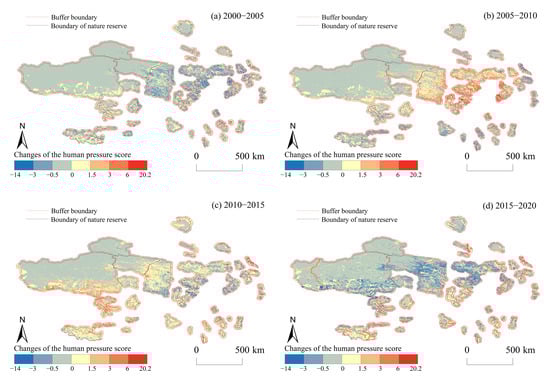In the late 1990s and early 21st century, large national NRs such as Sanjiangyuan, Lalu Wetland, and Hoh Xil were established in the Qinghai–Tibet Plateau. From 2000 to 2005, the pressure of population growth in the internal and external buffer zones of the NRs showed a decreasing trend, which was greater outside than inside the national NRs, and was observed mainly in the central and eastern reserves of the plateau, especially in the Sanjiangyuan National NR (Figure 4). From 2005 to 2015, HP values in the internal and external buffer zones of the NRs increased, and in the latter, the values were considerably higher. From 2015 to 2020, the trend in both zones also increased because of road construction, and HP values increased less in the internal NR zones. From the aspect of spatial changes, HP mainly increased in the southern Qinghai–Tibet Plateau from 2000 to 2020.