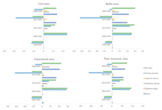 In each same period, the HP values in the three functional areas decreased, moving from the experimental area to the buffer area and core areas, in that order. These values showed a downward trend from 2000 to 2005, and the largest drop was detected in the experimental area (0.2321), followed by the core area and buffer area, in that order. From 2005 to 2015, the HP values in the three functional areas all increased, with the lowest increase detected in the core area, followed by the buffer area and experimental area (Figure 7). From 2015 to 2020, the values declined in three functional areas, and the decrease was largest in the experimental area, followed by buffer area and core area, due mainly to the reduction in grazing intensity.