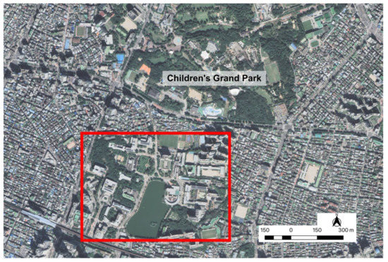 In terms of accessibility, the study utilized the main campus of Konkuk University, Seoul, South Korea, to survey the air quality at various environmental context sites (Figure 1). Customized weather stations which measured PM10, PM2.5, temperature, and humidity were installed at five locations on the campus. The university is located in the central-eastern part of Seoul, which is one of the most highly urbanized cities in the world. It is surrounded by major roads, large residential areas, and commercial skyscrapers. In particular, Children’s Grand Park, a large open space, is situated to the north. However, various types of open spaces such as lakes, forests, and playgrounds are scattered across the campus, providing different types of environmental contexts. The total area was 473,565 m2, and the total number of buildings used in the modeling was 48. Furthermore, the tallest building was 61.4 m, whereas the smallest structure was 2.2 m, and the common material of the buildings was mostly reinforced concrete (Figure 2).