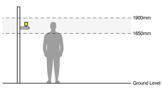 Normally, automated weather stations (AWS) are placed on higher ground, such as building roofs, to obtain steady readings and accessibility. However, such locations do not reflect the daily lives of the general public in urban areas. Therefore, unlike common AWS in other studies, this research attempts to collect credible and realistic data for ordinary urban life; the sensors were placed between 1650 mm and 1900 mm, which is the breathing height range for most people fall (Figure 4).