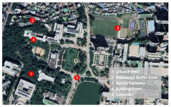 As previously described, the case study site was a university campus in Seoul. Within the campus, five locations were selected based not only on environmental contexts, but also on their openness and concealment (Figure 5).
