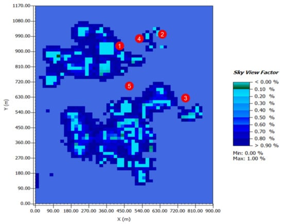 Calculated sky view factors of the site (the numbers represent each location of sensors).