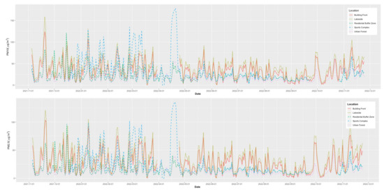 With the measured data, the researchers initially started to visualize the every minute measurement of PM10 and PM2.5 in a time-series format for the collected datasets between November 2021 and November 2022. However, this could not be illustrated effectively because of the density of the data. Therefore, this research used resampling tools in order to obtain the daily average values from the minutely collected data and to illustrate the five locations, as shown in Figure 7.