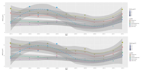 In Figure 9, the daily average values from the collected data are presented in a scatterplot for the duration of March 2022. Then, LOESS (weighted scatterplot smoothing) was implemented to provide an overall impression of the trends without fitting parametric models to allow for flexibility in understanding the overall tendencies. By doing so, this analysis effectively explored the trends in PM level changes in the specific environmental contexts.