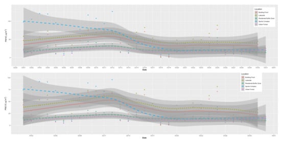 In this analysis (Figure 9), the spatial hierarchy based on the environmental context was demonstrated more clearly than the results in Figure 7 and Figure 8, which were yearly time-series analyses. However, it needs to be mentioned that the PM10 and PM2.5 concentration levels at the sports complex location behaved unpredictably, showing patterns similar to those in Figure 7 and Figure 8. Therefore, apart from the sports complex location, the PM concentration levels at the four locations illustrated certain patterns and hierarchies. First, there could be two main groups: those with higher and lower PM levels. The higher group is composed of the lakeside and building-front locations. The measured PM levels in the higher group were recorded to be approximately 10 to 30 mg/m3 higher than in the lower group, which includes the residential buffer zones and the urban forest locations. Then, the PM level gap between the lakeside and building front locations within the higher group was continuously steady at approximately 10 mg/m3. The measured PM levels in the lower group, the residential buffer zone and the urban forest locations, were relatively similar. The differences between the residential buffer zone and the urban forest were quite narrow, ranging from 0 to 6 mg/m3.