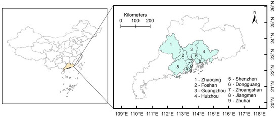 The Pearl River Delta (PRD) area, one of three premier megaregions in China, lies in the Guangdong Province in the south of China (Figure 1). The PRD has a total land area of 42,200 km2 and a population of 78.61 million in 9 prefecture-level cities. Guangzhou has the largest permanent population in PRD with 18.8 million people. There are 17.68 million people in Shenzhen, 10.53 million people in Dongguan, and 9.61 million people in Foshan [33]. The 9 cities in the PRD are closely connected, with a straight-line distance of fewer than 200 km, and can be reached within 3 h by driving. The longest driving distance is 218.9 km from Shenzhen to Zhaoqing, and the shortest driving distance is from Guangzhou to Foshan.