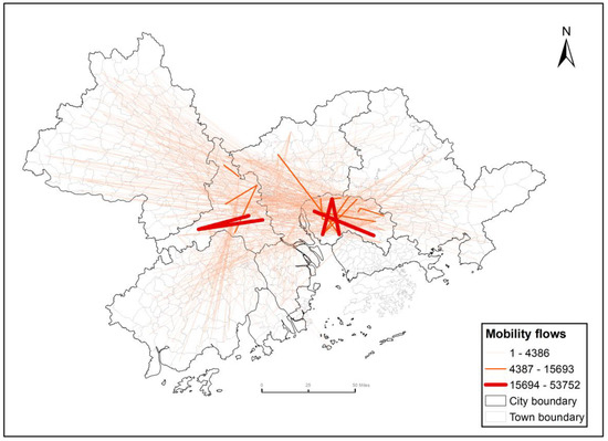 The dependent variable was indicated by the total frequency of population flow between towns. The flow data were extracted from a large set of mobile phone signaling data provided by China Telecom, one of three mobile communication operations in China. Its customers account for 20% of the population, and the representative dataset included information on the estimated locations of each cellphone user during April 2018. There are more than 12 million commuters distributed in 612 rural towns from 60 sub-cities of the Pearl River Delta (PRD) area. Since the original geographical resolution of data is 500 m, we aggregated the flow data by rural town divisions. This study used the external linkages from or to other rural towns to measure the strength and change in population flows. There are a total of 1,518,068 flows from 17,205 pairs of connected towns, and we omitted 11,185 pairs, which are 0, to obtain 6020, including 3157 for commuting and 2863 for non-commuting (Figure 2).