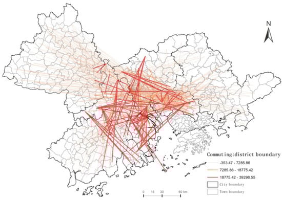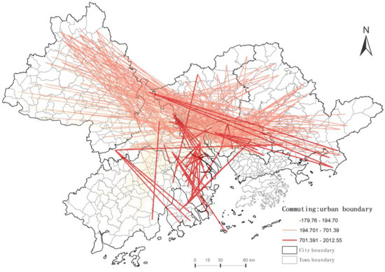 There are more significant links which connect north and central areas for non-commuting. Our findings suggest that Guangzhou appears to play a more central role, which is consistent with Yeh et al. [42]. These results indicate that the employment density is high in areas of Guangzhou–Foshan–Dongguan, suggesting that the development of intercity transport infrastructure, such as intercity commuter rails, may play an important role in shaping the configuration of two existing regional cores (Guangzhou-led). However, the third core (near Zhuhai) does not seem to have met expectations of the outlined Development Plan, and more connected railways and other transport facilities can be built in the future.
