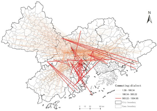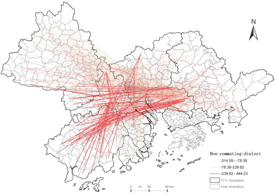 Taking dialect as the test variable, we found that the coefficient is significantly positive, showing that communication between two towns is closer where the dialects are the same. Specifically, the commuting links of rural mobility exhibit greater significance within the region encircling the Pearl River., while the links across the east and west are more significant for non-commuting links (Figure 4).