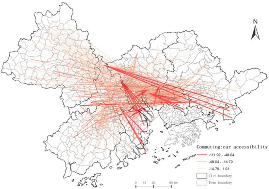 Transportation interconnection plays an important role in regionalization, reducing developmental disparity, and achieving common prosperity [41]. It connects villages and towns in inter-town rural mobility and affects regional accessibility. The FGWR model gives a local and accurate degree of influence. Car accessibility is negatively associated with mobility, that is to say, the less time used, the more links in the two towns. Given the poor physical transportation, distance is a more important factor than municipality boundary, and the mobility between villages and towns that are relatively far away despite belonging to the same municipality can be hindered. As a result, the distance between villages and towns is generally greater than that of a bicycle, and a car is generally the most appropriate mode choice; therefore, the higher the accessibility by car, the stronger the connection between the two places. Table 2 supports our point of view.