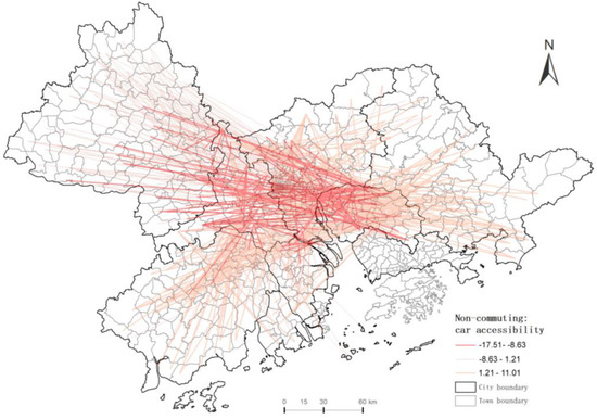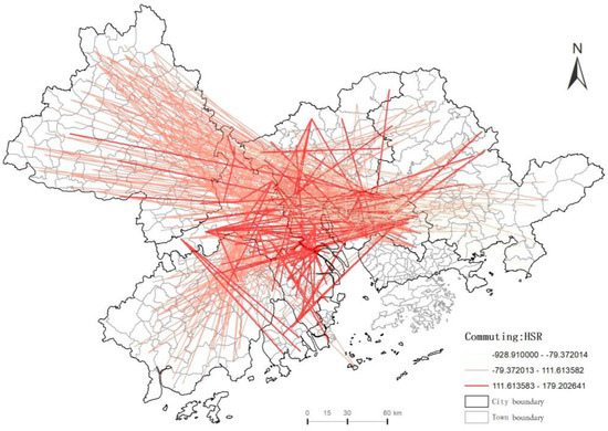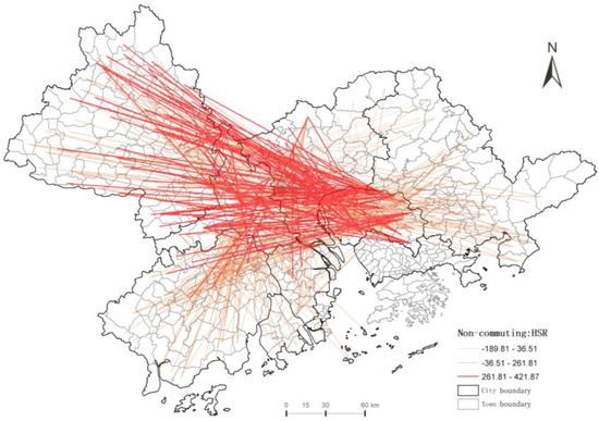 Similarly, for commuting, HSR is significantly positive between core cities along the Pearl River, while it is more significant in connections between the northwest and center regions for non-commuting (Figure 6). In the vast rural areas, Foshan–Dongguan–Zhongshan are relatively developed towns, which are also employment centers with a cross-district commuting distance beyond urban public transport and private car. HSR is a regular way to fill this gap for business trips and working purposes. By comparison, the non-commuting links are dominant in the northwest, which owns rich ecological and natural tourism resources.