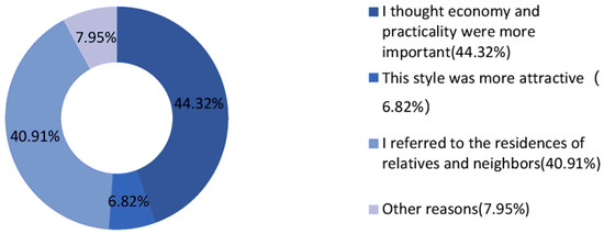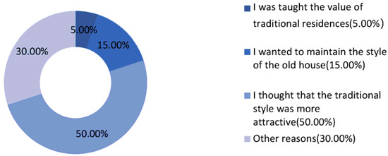 In terms of participation, nearly 65% of the respondents expressed that they were willing to participate or assist in protection activities, while only 9% said that they were unwilling to do so, which shows that the villagers were highly enthusiastic about the village’s protection (Figure 5). However, only 18.52% of the respondents reported considering the need to maintain consistency with traditional features when choosing the form, material, and color of their residences’ roofs. Among the villagers who reported that they did consider the need to maintain consistency with traditional features, 65% expressed that traditional features were better or that they were willing to continue to maintain these kinds of features, and only 5% of them were educated about the value and significance of traditional features (Figure 6), indicating that the popularization of the protection of traditional features needs to be further increased. As for the respondents whose houses’ roofs differed greatly from the houses’ traditional features, only 6.82% expressed that their current roof forms were more beautiful than before, and the rest reported choosing their current roof forms because of various constraints, such as economics and practicality, as well as the neighborhood (Figure 7). It was also found that it is more likely that more villagers will choose the same traditional features in the future.