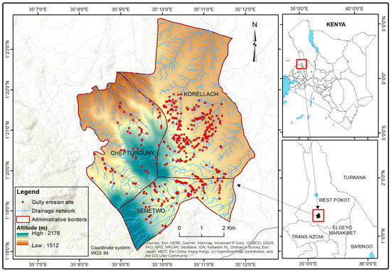 Soil is a precious and irreplaceable natural resource that offers vital ecosystem services and performs multiple ecological functions to support life on Earth. It plays a role in the production of food, fodder and timber, purification and storage of water, cycling of nutrients, filtration of toxic substances, and preservation of biodiversity, among others [1]. Despite this, a third of the world’s soils are degraded, with 25–40 billion tons of soil being lost annually due to erosion [2,3]. This has implications for the productivity, resilience and sustainability of both agricultural and ecological systems [4]. Although soil erosion is global, Africa is the worst-hit continent, with the most destructive process being gully erosion [5]. Gully erosion is a complex and destructive geomorphic phenomenon driven by various environmental factors, including soil type, lithology, topography, climate, land use and vegetation [6,7]. For instance, in parts of East Africa, it has been attributed to increased overland flow owing to the declining and low vegetation cover [8]. Gully erosion is of great concern to scientists because runoff concentrates and flows detach and transport large amounts of soil particles, carving out wide (>0.3 m), deep (>0.6 m) and long channels across the landscape, causing many problems downstream [9,10]. The channels, which are difficult to eliminate, can stem from mechanisms, such as incision, piping, fluting, mass wasting, subsurface flows, and the development of rills and cracks in the soils [11,12].