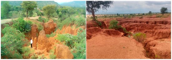 16. Yazie, T.; Mekonnen, M.; Derebe, A. Gully erosion and its impacts on soil loss and crop yield in three decades, northwest Ethiopia. Model. Earth Syst. Environ. 2021, 7, 2491–2500. [Google Scholar] [CrossRef]