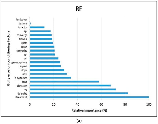 Nonetheless, the ranking of the most important conditioning factors seemed plausible because, for instance, it was evident from the resultant maps and field observations that most of the areas with high to very high gully erosion susceptibility were concentrated around the drainage channels and on the eastern and southeastern parts where the elevation was relatively low. Tien Bui et al. [25], Nhu et al. [29] and Pourghasemi et al. [31] also found that gully erosion evolved as the distance to streams decreased, drainage density increased and elevation decreased. This can be attributed to the effects of these factors on the flow magnitude, velocity and concentration, as well as on the sediment transport capacity, vegetal cover and mechanisms, such as incision, seepage and piping [24,67].