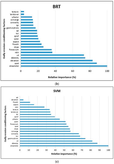 Unlike the logit model, which estimated the parameters that quantified the effects of the conditioning factors on the likelihood of gully erosion occurrence, the three machine learners ranked their significance based on their mean-decrease-in-accuracy scores (Figure 4a–c). These scores were subsequently converted into percentages. The results showed that the boosted regression trees, support vector machines and random forest models ranked the conditioning factors somewhat differently. According to the support vector machines and random forest models, distance to stream was the most important determinant of gully erosion susceptibility, followed by the drainage density and valley depth (Figure 4a,c), whereas the boosted regression trees model ranked sand content, elevation and stream density as the three most important factors that control gullying (Figure 4b). Furthermore, the results showed that land cover had the least influence in the boosted regression trees and random forest models, while the stream power index had the lowest importance in the support vector machines model. It is also notable that the order of importance of the 21 conditioning factors varied depending on the machine learning algorithm used for model development.