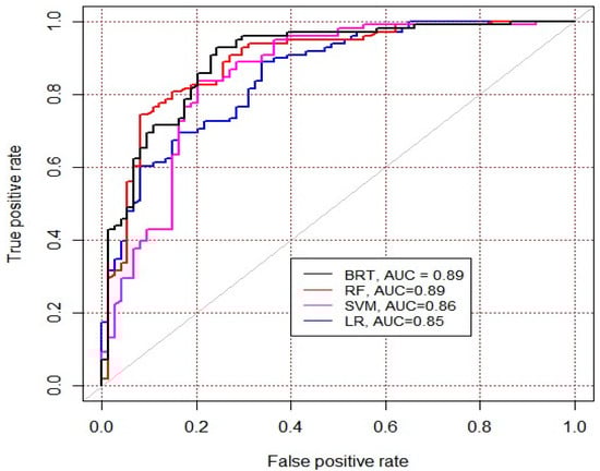 Again, the three machine learning methods yielded slightly different performance results in the same environment and a small improvement in the accuracy of predicting gully erosion. Boosted regression trees and random forest models returned the highest AUC (0.89), followed by support vector machines (AUC = 0.86) and logistic regression (AUC = 0.85). The better performance of the random forest model compared to the support vector machines and logistic regression models coincides with the findings of comparable studies conducted in other regions [32,33,69,70,71]. However, the similarity of performance exhibited by the boosted regression trees and random forest models differs from the results of Arabameri et al. [23], Chuma et al. [65], Hembram et al. [72], Amiri et al. [73], Rahmati et al. [74] and Wang et al. [75], who reported that random forest outperformed the boosted regression trees in modeling gully erosion susceptibility. The superiority of random forest has been proven in many environmental modeling studies, such as landslide susceptibility mapping, because, as Youssef et al. [76] pointed out, it generates stable results, avoids overfitting and deals with missing data, outliers and multi-collinearity relatively well.